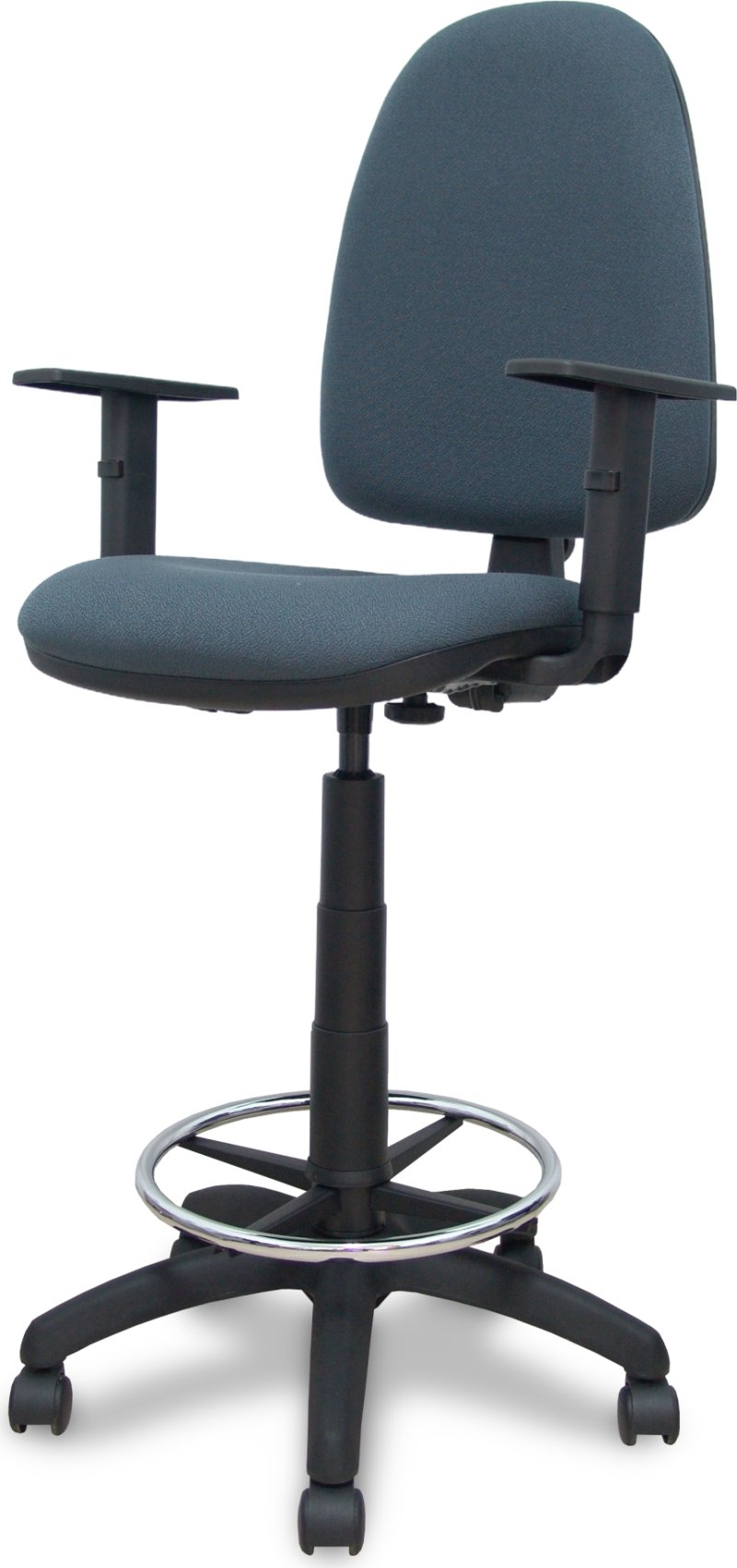 PIQUERAS Y CRESPO Taburete ergonómico con mecanismo de contacto permanente, regulable en altura y aro reposapiés Taburete de gran sencillez pero a la vez de buenísima calidad apto para cualquier tipo de uso en diferentes ambientes(oficina, taller, hogar, etc.). Su uso es recomendado para talleres u oficios donde haya que estar de pie la mayor parte del tiempo. Su principal y mejor característica es el aro reposapiés cromado, que proporciona un gran descanso a los pies. Si busca un taburete a buen precio y buena calidad el modelo T04 es su mejor opción Detalles técnicos Respaldo ergonómico para una mayor adaptación de la espalda. Respaldo interior de polipropileno con refuerzo panal de 20mm de grosor. Espuma de 5 cm de grosor y densidad 20 kg/m3 Asiento ergonómico para una mayor comodidad del usuario. Asiento interior de polipropileno con refuerzo panal de 20mm de grosor. Espuma de 5 cm de grosor y densidad 25 kg/m3 Asiento y respaldo tapizados en tejido BALI color gris oscuro Mecanismo de contacto permanente Regulación del respaldo en altura, profundidad e inclinación Regulable en altura mediante cilindro de gas. Brazos regulables de color negro incluidos Giratoria 360° Telescópico color negro Aro reposapiés cromado Base poliamida de alta resistencia de 5 radios y 55 cm de diámetro, en color negro Ruedas de nailon Otros detalles Favorece una buena postura integral para evitar posibles problemas de espalda Ergonómica 36 meses de garantía FABRICACIÓN ESPAÑOLA Instrucciones de montaje incluidas Fácil montaje Para pedidos de gran volumen, póngase en contacto con nosotros para consultar disponibilidad