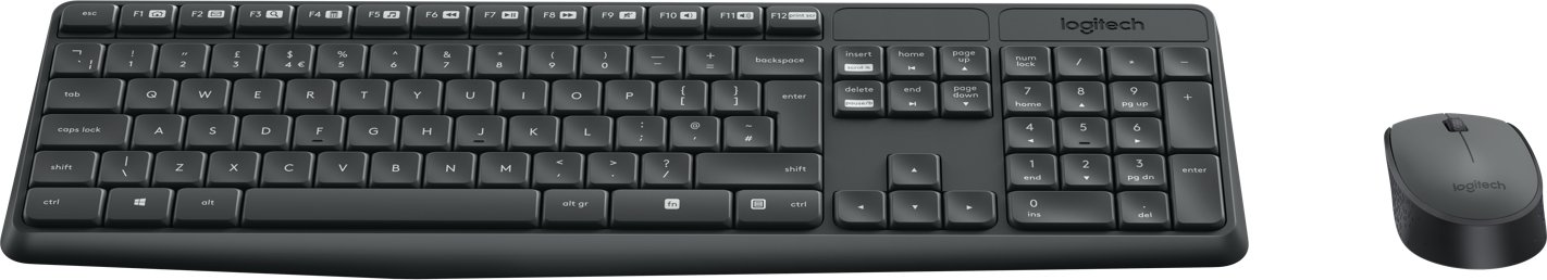 Logitech MK235. Formato del teclado: Completo (100%). Estilo de teclado: Derecho. Tecnología de conectividad: Inalámbrico, Interfaz del dispositivo: RF inalámbrico, Diseño de teclado: QWERTZ, Teclado, cantidad de teclas: 100, Uso recomendado: Hogar. Color del producto: Gris. Ratón incluido