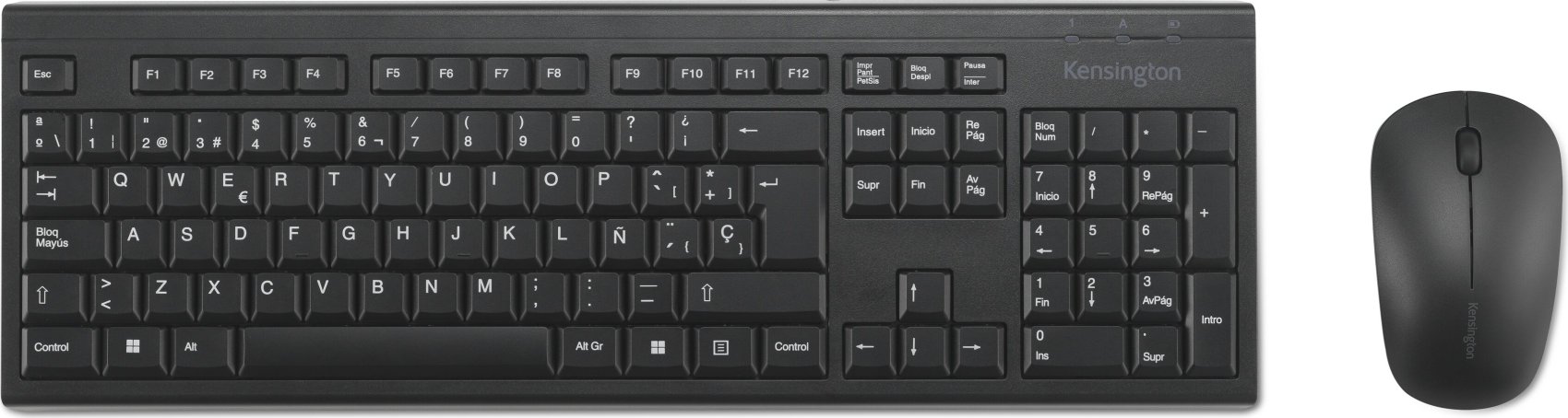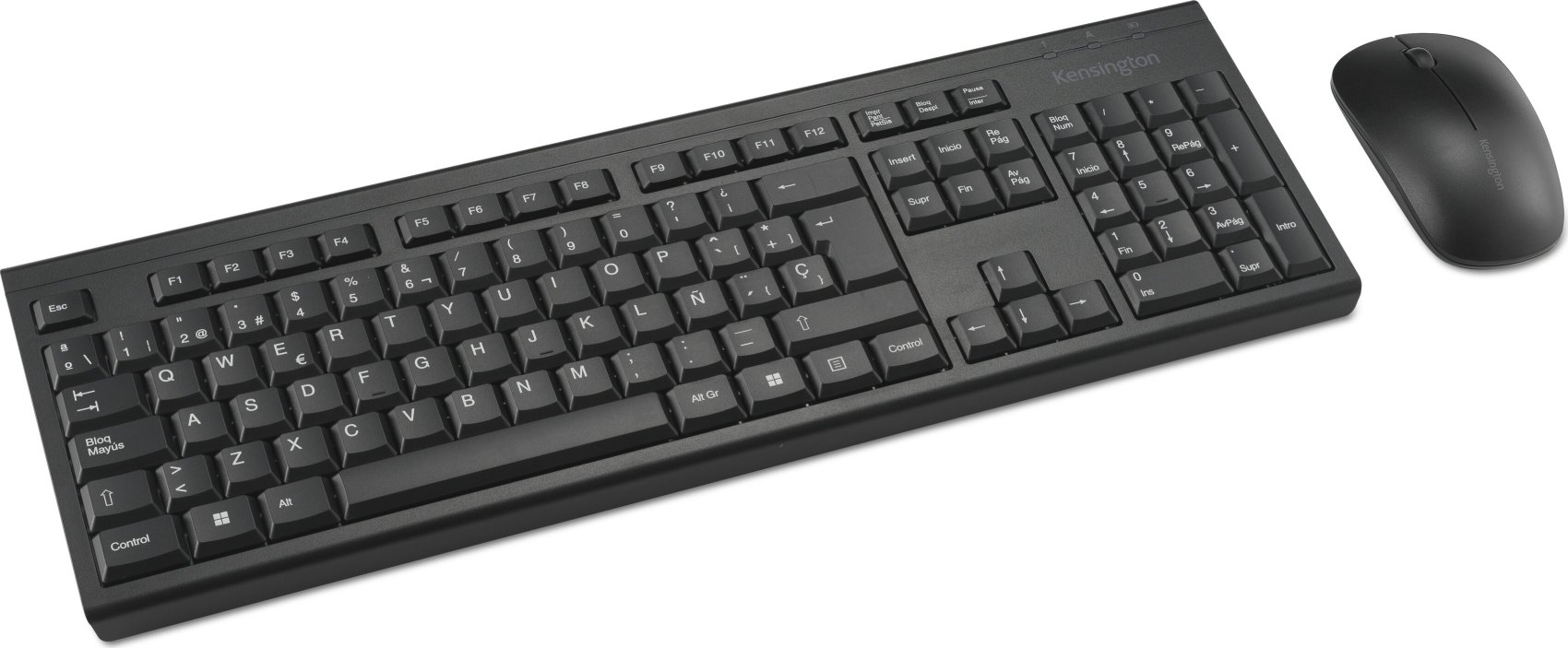 Kensington Conjunto de teclado y ratón inalámbricos KM150 EQ para sobremesa. Formato del teclado: Completo (100%), Tecnología de conectividad: Inalámbrico, Interfaz del dispositivo: RF inalámbrico, Interruptor del teclado: Interruptor de membrana, Diseño de teclado: QWERTY, Teclado, cantidad de teclas: 105, Uso recomendado: Oficina. Color del producto: Negro. Ratón incluido