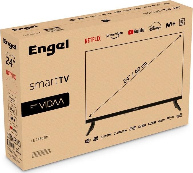 El televisor Engel Smart TV VIDAA es un televisor inteligente de 24" con resolución HD. Ofrece una calidad de imagen y sonido excepcional, potenciado con el sistema operativo VIDAA que lo hace compatible con las APPs oficiales de Netflix, Amazon, Disney+, DAZN, Movistar+, etc. También cuenta con un diseño sin marcos y calidad de audio Dolby Digital.