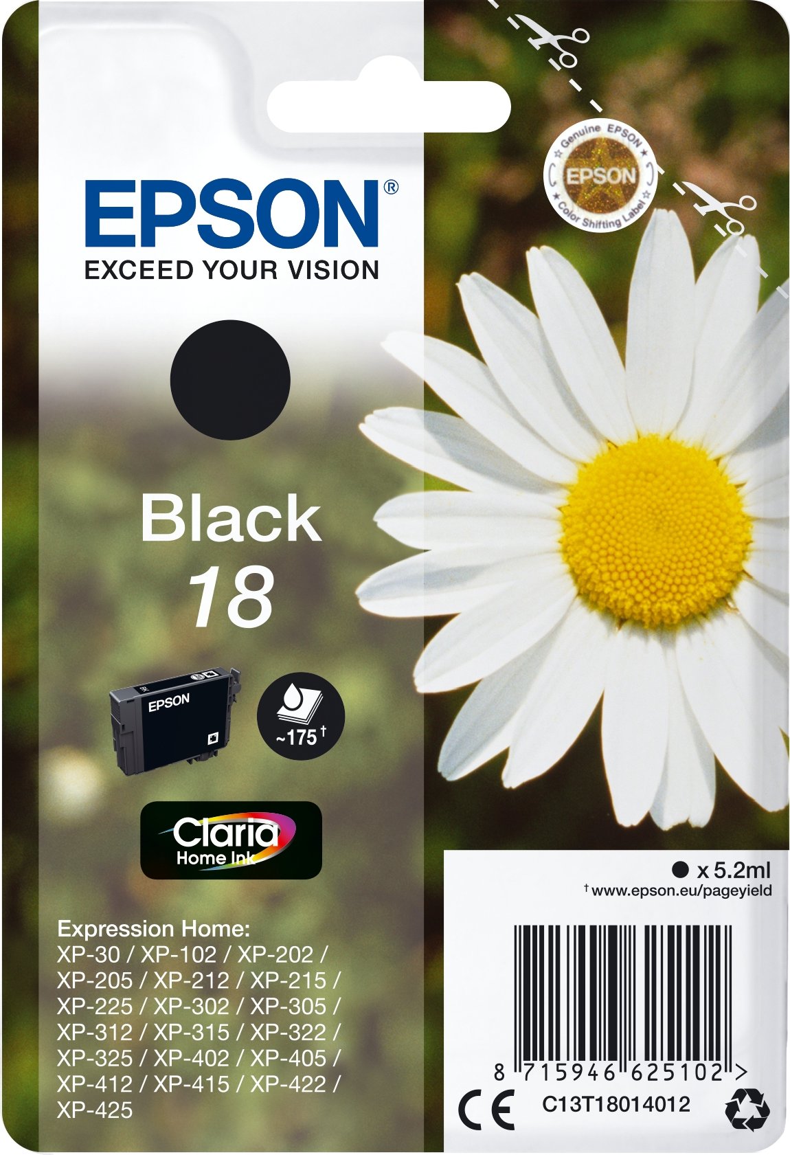 Epson Daisy Cartucho 18 negro (etiqueta RF). Tipo de tinta negra: Tinta a base de pigmentos, Volumen de tinta negra: 5,2 ml, Cantidad por paquete: 1 pieza(s), Rendimiento de impresión de página con tinta negra: 175 páginas