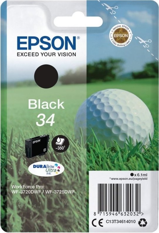 Epson Golf ball Singlepack Black 34 DURABrite Ultra Ink. Tipo de cartucho de tinta: Rendimiento estándar, Tipo de tinta negra: Tinta a base de pigmentos, Volumen de tinta negra: 6,1 ml, Cantidad por paquete: 1 pieza(s), Rendimiento de impresión de página con tinta negra: 350 páginas