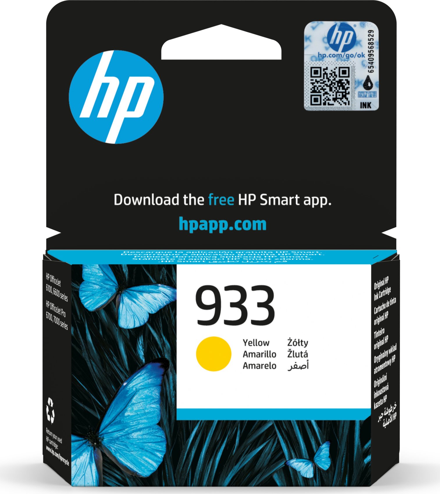 HP Cartucho de tinta Original 933 amarillo. Tipo de tinta de color: Tinta a base de pigmentos, Tipo de cartucho de tinta: Rendimiento estándar, Tipo de suministro: Pack individual, Rendimiento de impresión de página con tinta de color: 330 páginas, Volumen de tinta de color: 3,5 ml, Colores de impresión: Amarillo, Cantidad por paquete: 1 pieza(s)