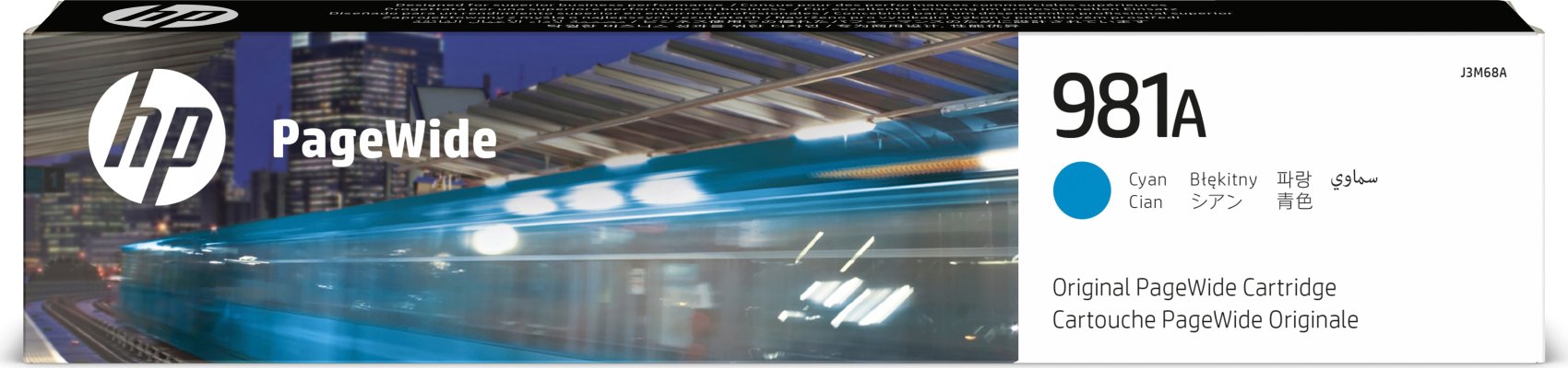 HP Cartucho original PageWide 981A cian. Tipo de tinta de color: Tinta a base de pigmentos, Tipo de cartucho de tinta: Rendimiento estándar, Rendimiento de impresión de página con tinta de color: 6000 páginas, Volumen de tinta de color: 70 ml, Colores de impresión: Cian, Cantidad por paquete: 1 pieza(s)
