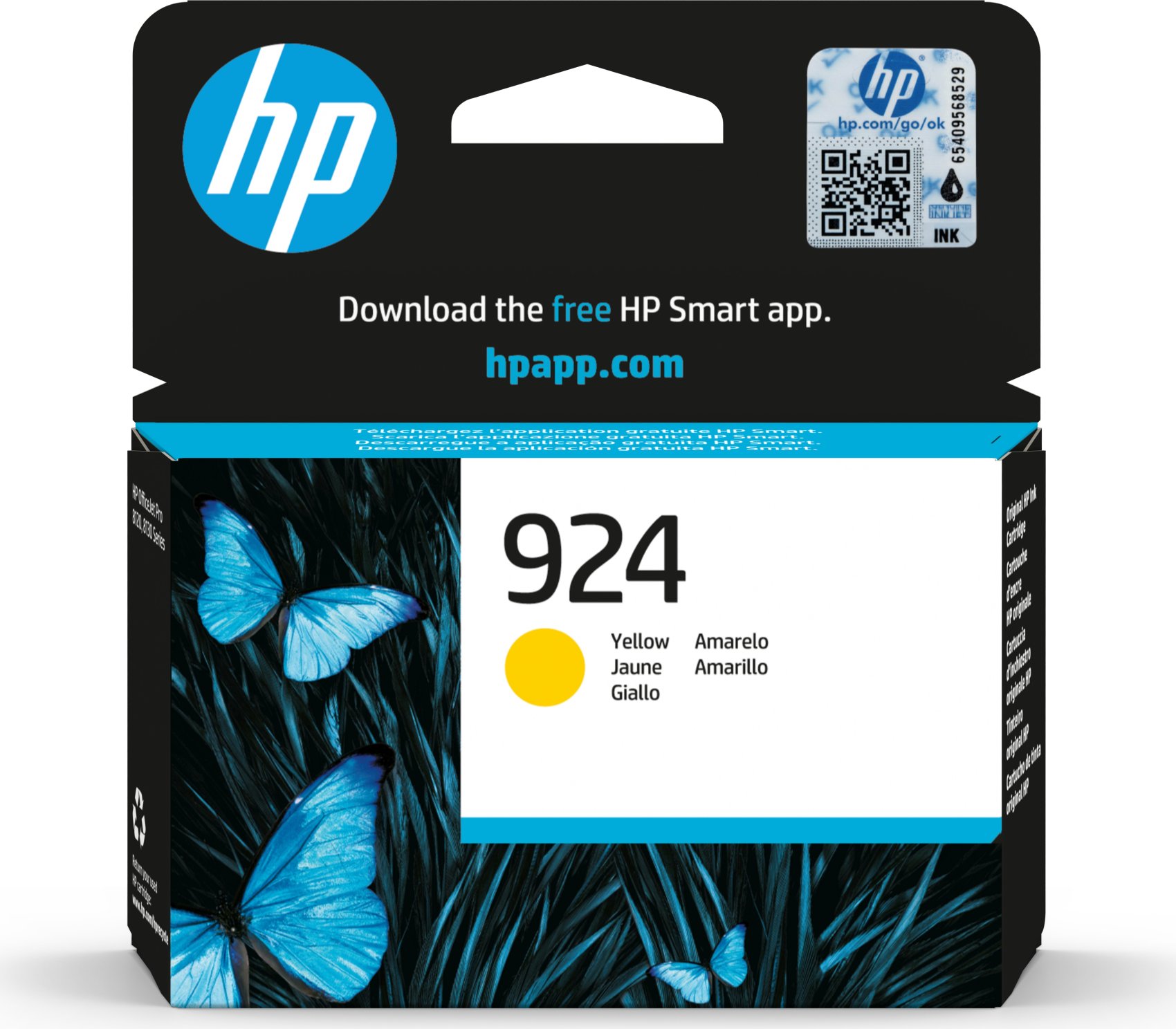 HP Cartucho de Tinta Original 924 amarillo. Tipo de cartucho de tinta: Rendimiento estándar, Tipo de suministro: Pack individual, Rendimiento de impresión de página con tinta de color: 400 páginas, Colores de impresión: Amarillo, Cantidad por paquete: 1 pieza(s)