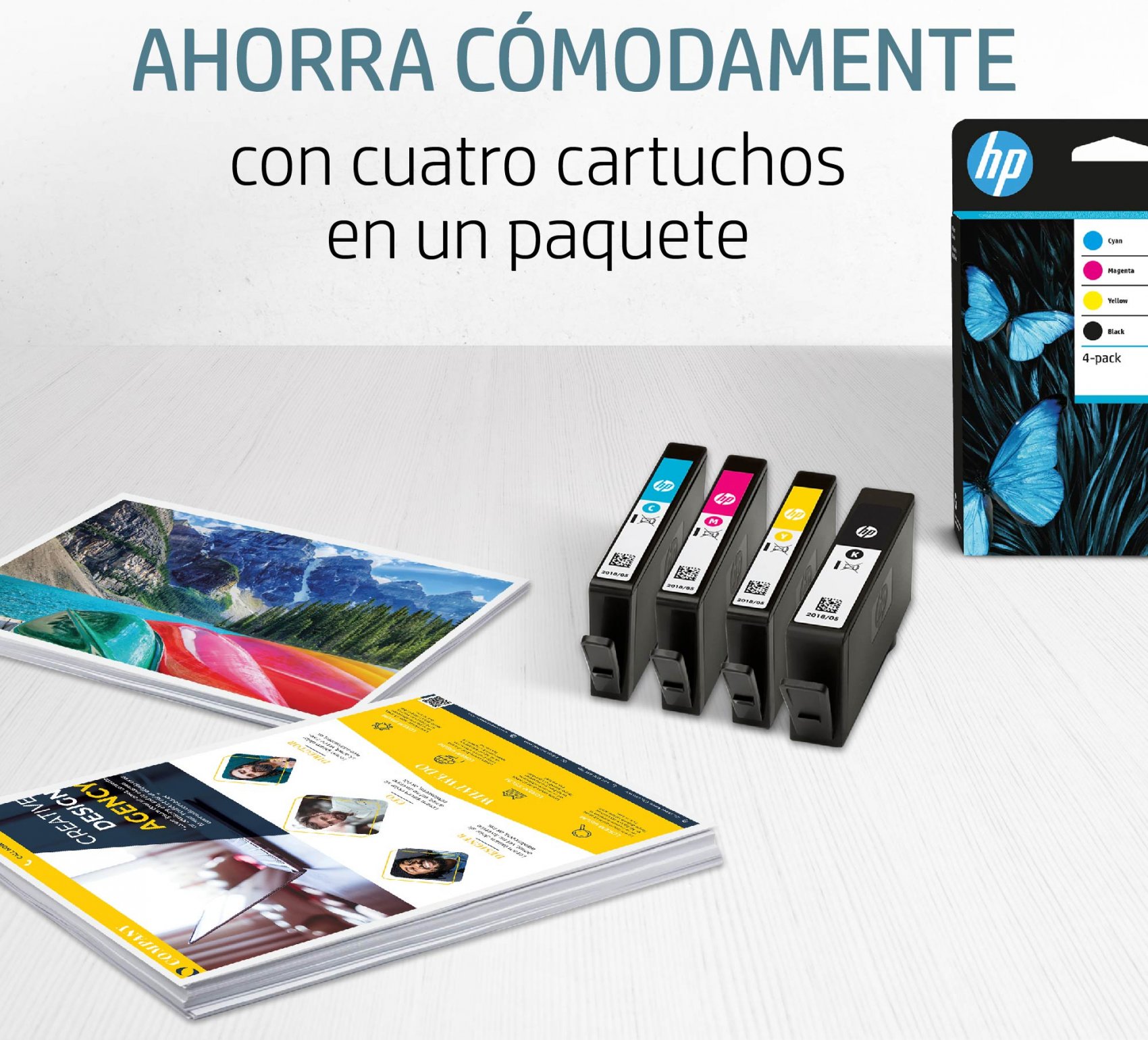 - 4 cartuchos de tinta: 1 cartucho estándar negro y 1 cartucho de cada color (cian, magenta y amarillo)