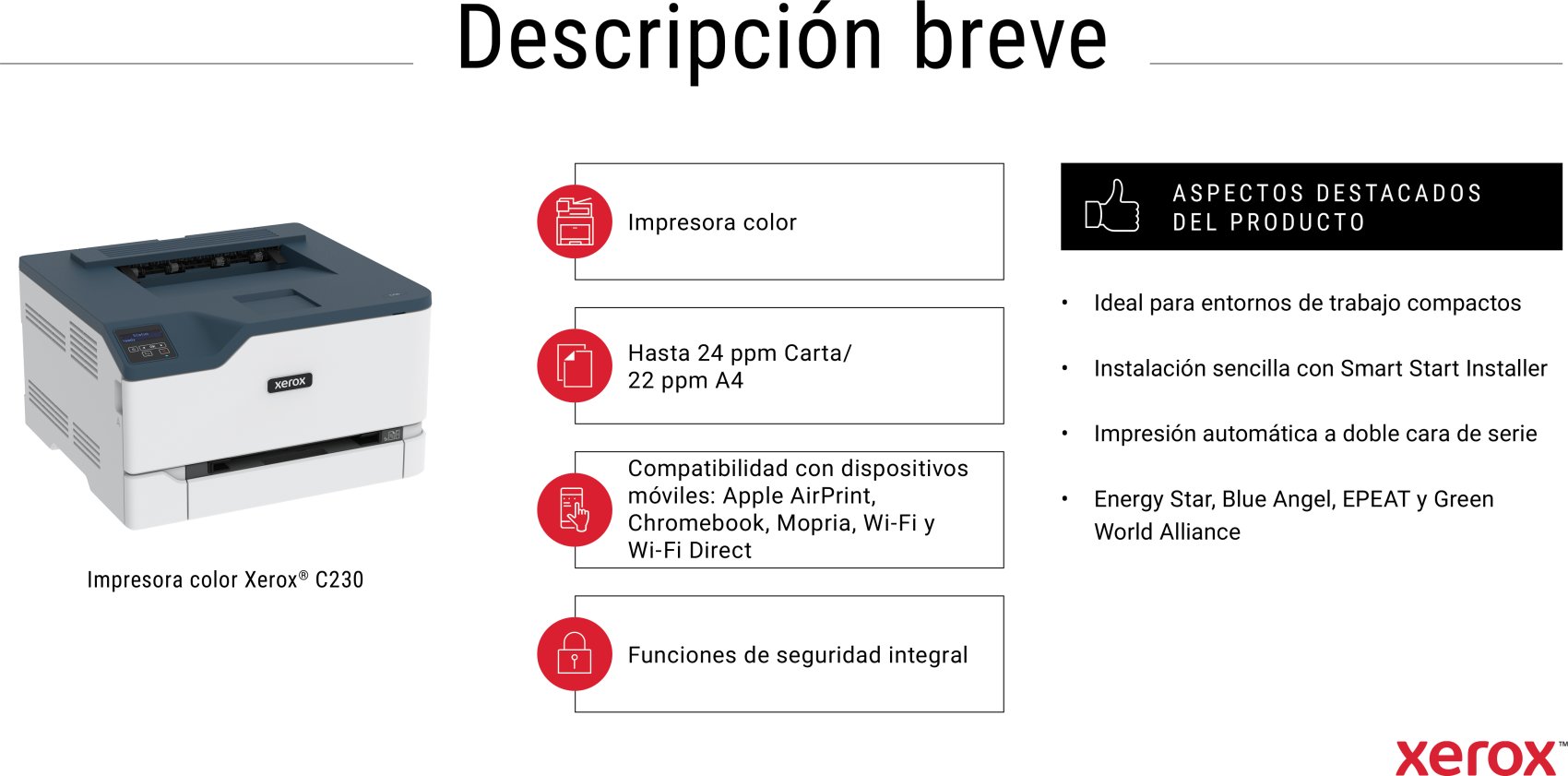 Xerox C230 A4 22 ppm Impresora inalámbrica a doble cara PS3 PCL5e6 2 bandejas Total 251 hojas. Tecnología de impresión: Laser, Color. Número de cartuchos de impresión: 4, Ciclo de trabajo (máximo): 30000 páginas por mes. Resolución máxima: 600 x 600 DPI. Tamaño máximo de papel ISO A-series: A4. Velocidad de impresión (negro, calidad normal, A4/US Carta): 22 ppm, Impresión dúplex. Pantalla: LCD. Wifi. Color del producto: Azul, Blanco