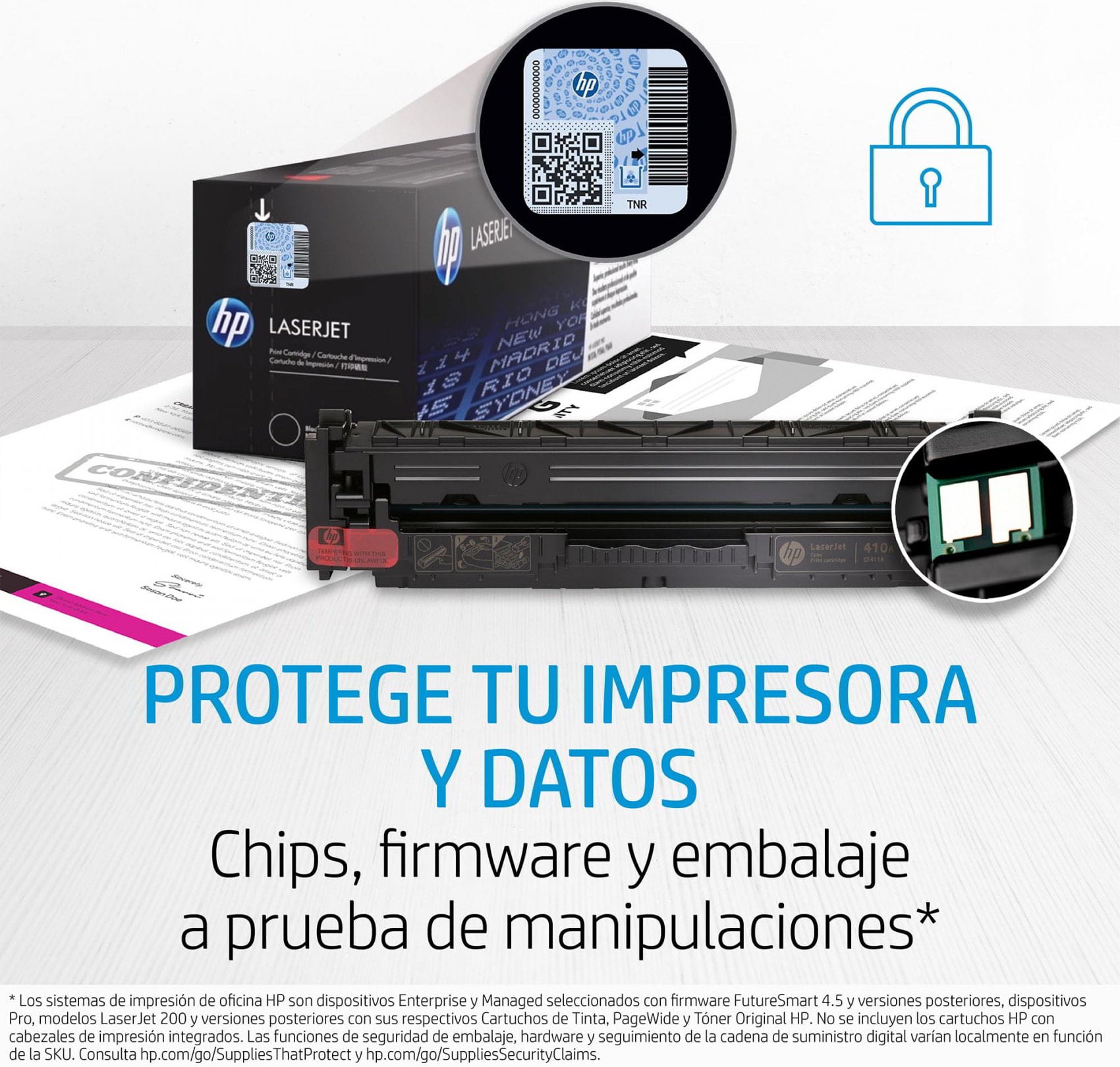Elige los Cartuchos de Tóner Original HP LaserJet que se han diseñado para que funcionen con tu impresora HP y con la seguridad de los chips a prueba de manipulaciones.[1]