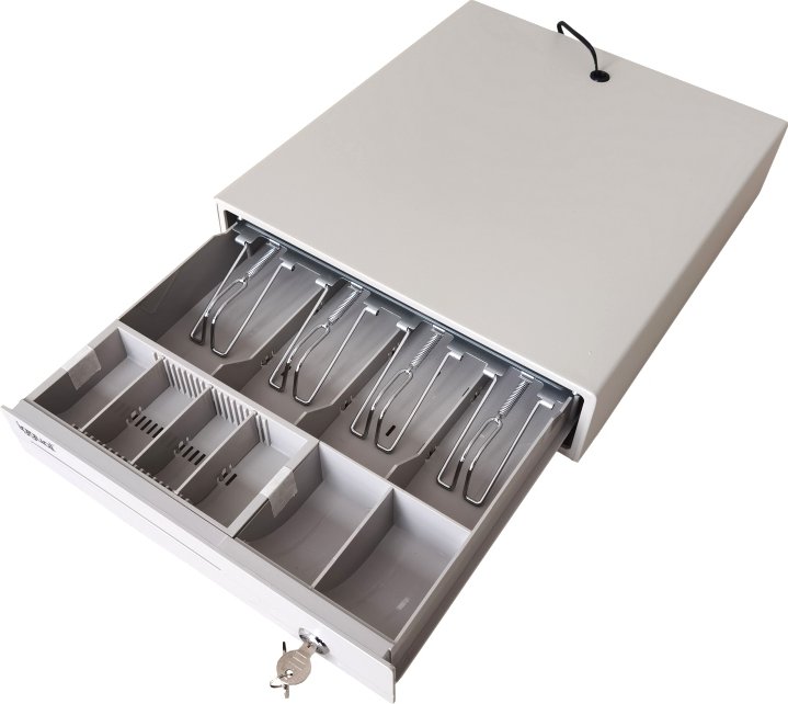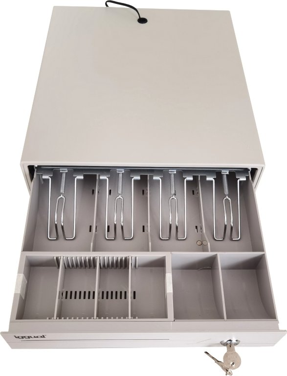El IRON-1W* es un cajón portamonedas eléctrico fabricado con materiales de 1ª calidad. Dispone de compartimento de billetes y cajonera de monedas extraíble, ambos totalmente ajustables. Dispone de ranuras frontales para guardar cheques sin necesidad de abrir el cajón. Llave con bloqueo de tres posiciones y cable de conexión plano de 1m.