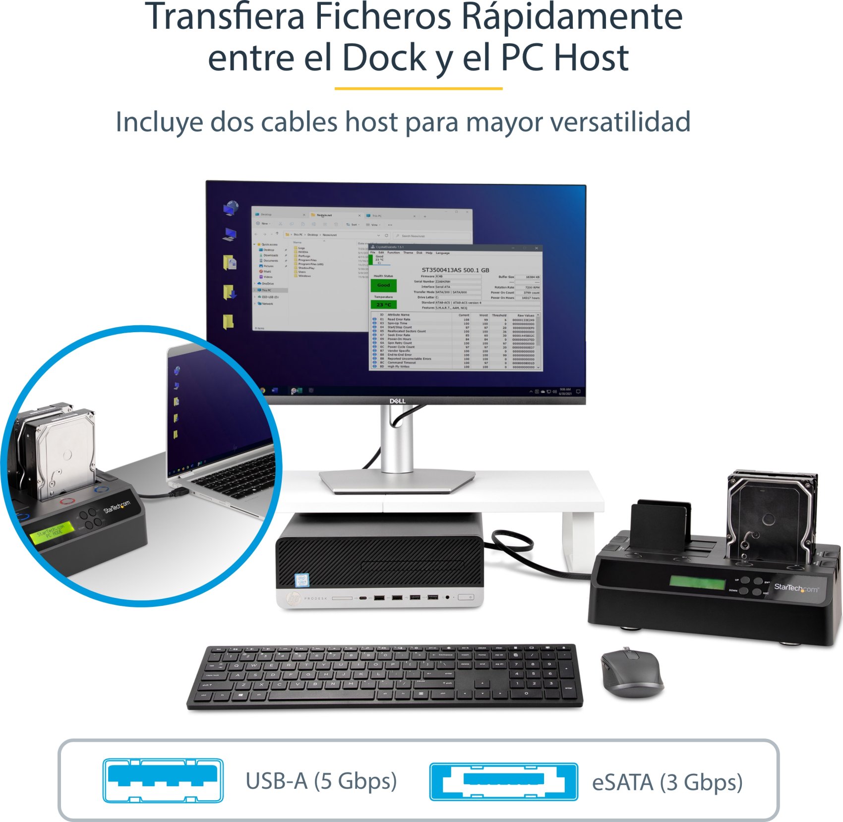 Capaz de realizar una clonación de sectores 1:3, incluyendo HPA, desde una sola unidad SATA a otras tres simultáneamente (a una velocidad de hasta 72 MBps), el clonador/docking station puede ahorrarle tiempo y esfuerzo. Como estación de acoplamiento de discos duros externos, puede conectarse a su ordenador principal a través de USB 3.0 o eSATA, proporcionando velocidades de transferencia de datos de hasta 5 Gbps o 3Gbps respectivamente, desde los discos duros a su sistema informático.