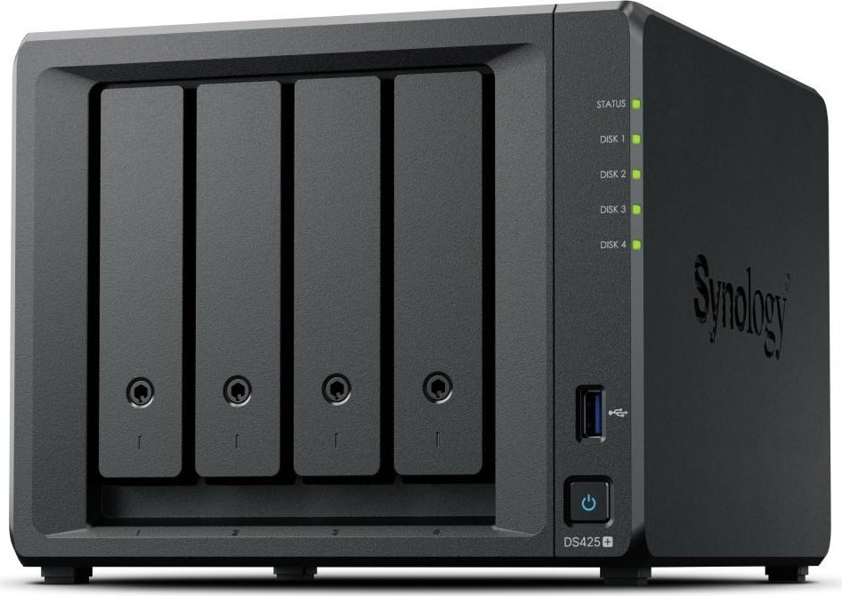 Synology nas diskstation ds425+ cpu intel celeron j4125 ddr4 2gb 4 bahias 3.5" hdd 2.5" hdd 2.5" ssd + 2 ranuras m.2 raid 0, 1, 5, 6, 10, jbod capacidad maxima por disco duro 80tb 2xusb 3.2 2xethernet 1.5gb