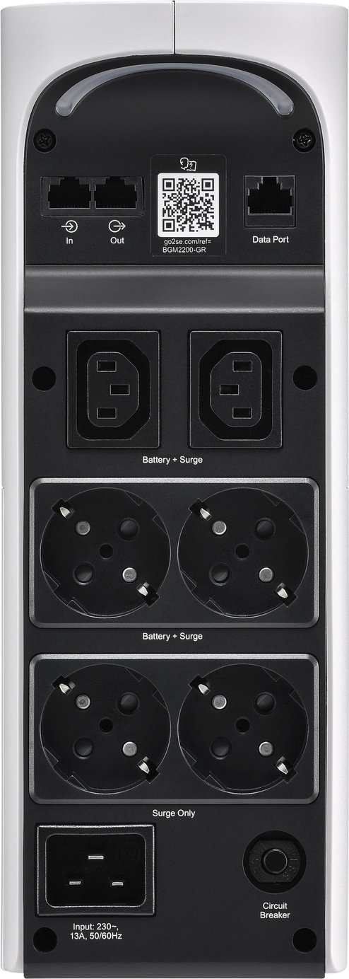 APC BGM2200-GR. Topología UPS: Línea interactiva, Capacidad de potencia de salida (VA): 2,2 kVA, Potencia de salida: 1320 W. Tipo de salida AC: C13 acoplador, Cantidad de salidas AC: 6 salidas AC, Tipo de serie de interfaz: RJ-45. Tecnología de batería: Sealed Lead Acid (VRLA), Voltaje de la pila: 24 V, Vida útil de la batería (máx.): 5 año(s). Factor de forma: Torre, Color del producto: Blanco, Capacidad del rack: 0U. Certificación: IEC 62040-1-1 IEC 62040-2